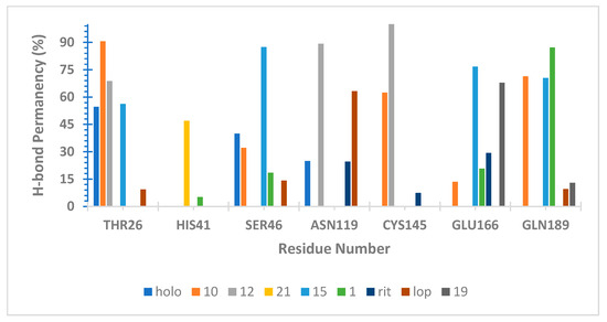 The H-bond pattern presented interactions with His41 and Cys145 (catalytic residues); Thr25 and 26 from S1′; Gly143 and Ser144 from the canonical oxyanion role on S1 [41]; Glu166 from S1; and Gln189 and Thr190 from S4 [40,42,43,46]. Since an H-bond is considered as the “driving force” for Mpro inhibition, we could map and analyze them through our MD simulations.