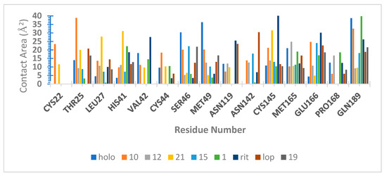 We also calculated the atomic contacts involving SARS-CoV-2 Mpro and peptide compounds (Figure 7). The contact surface area revealed additional interactions with apolar residues on the same sites described before [12,23,40,42,43,46]: S1′ (Thr25, 26, Leu 27, Cys145), S2 (His41, Thr45, Ser46, Asp48, Met49), S4 (Met165, Glu166, Leu 167, Gln189), and S5 (Pro168).
