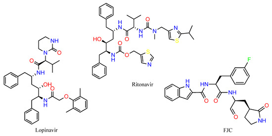 Mpro protease inhibitors lopinavir and ritonavir administered together for the treatment of COVID-19 [50,51] were used as controls and accessed from PubChem. Both drugs are part of the therapeutic scheme used to treat Human Immunodeficiency Virus (HIV) and they have reduced the viral load of β-coronavirus and improved the clinical condition in patients with the disease [50]. The high specificity of lopinavir through its active protease site contrasts with its reduced oral bioavailability and extensive hepatic metabolism. In this sense, ritonavir is co-administered to increase the plasma concentration of lopinavir and improve its antiviral activity. The crystallographic structure of the FJC (Figure 8—PDB ID: 6M0K) compound was used as a reference due to its strong inhibitory activity against SARS-CoV-2 (IC50 = 0.040 ± 0.002 µM) [29].