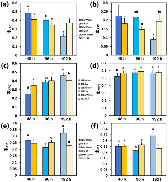 Light energy partitioning at PSII. The effective quantum yield of PSII photochemistry (ΦPSII) at low light (LL) (a) and at high light (HL) (b); the quantum yield of regulated non-photochemical energy loss in PSII (ΦNPQ) at LL (c) and at HL (d); and the quantum yield of non-regulated energy loss in PSII (ΦNO) at LL (e) and at HL (f) of water-sprayed or salicylic acid-sprayed (SA), celery plants at 48 h, 96 h, and 192 h after watering. Standard deviations (SD) are shown as error bars (n = 9, 3 independent experiments with 3 plants for each treatment and time point measurement). Significant differences are expressed by different alphabet letters.