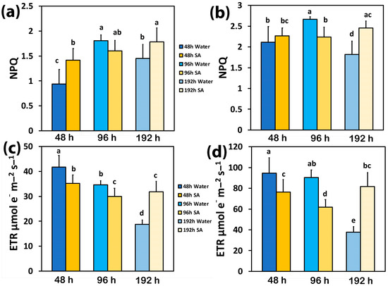 The non-photochemical quenching (NPQ) at low light (LL) (a) and at high light (HL) (b) and the electron transport rate (ETR) at LL (c) and at HL (d) of water-sprayed or salicylic acid-sprayed (SA) celery plants at 48 h, 96 h, and 192 h after watering. Standard deviations (SD) are shown as error bars (n = 9, 3 independent experiments with 3 plants for each treatment and time point measurement). Significant differences are expressed by different alphabet letters.
