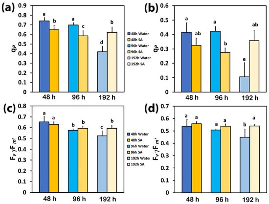 The photochemical quenching (qp), representing the fraction of open PSII reaction centers (RCs) at low light (LL) (a) and at high light (HL) (b), and the efficiency of the open PSII RCs (Fv′/Fm′) at LL (c) and at HL (d) of water-sprayed or salicylic acid-sprayed (SA) celery plants at 48 h, 96 h, and 192 h after watering. Standard deviations (SD) are shown as error bars (n = 9, 3 independent experiments with 3 plants for each treatment and time point measurement). Significant differences are expressed by different alphabet letters.