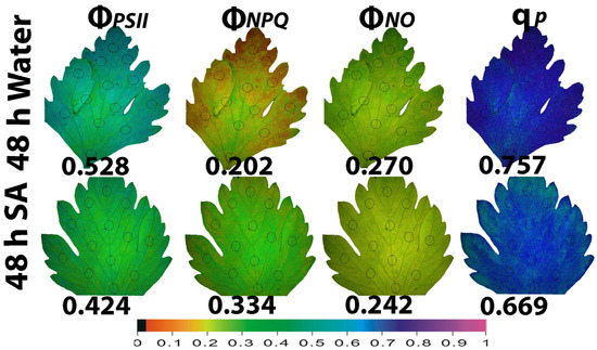 Whole leaf area color-coded pictures of ΦPSII, ΦNPQ, ΦNO, and qp, obtained at 200 μmol photons m−2 s−1, in water-sprayed and salicylic acid-sprayed (SA) celery plants at 48 h after watering. The average whole leaf value of each chlorophyll parameter is provided. At the bottom, the color code indicates the corresponding parameter value as color with a scale from 0 to 1.