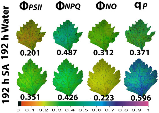 Whole leaf area color-coded pictures of ΦPSII, ΦNPQ, ΦNO, and qp, obtained at 200 μmol photons m−2 s−1, in water-sprayed and salicylic acid-sprayed (SA) celery plants at 192 h after watering. The average whole leaf value of each chlorophyll parameter is provided. At the bottom, the color code indicates the corresponding parameter value as color with a scale from 0 to 1.