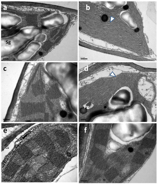 Most of the typical ultrastructural features of chloroplasts, such as plastid envelope integrity, abundance of grana, starch grains, and plastoglobuli, were noticed in celery leaves, resembling those that are constantly observed by transmission electron microscopy (TEM) in leaf cells (Figure 7). However, in the chloroplasts of SA-sprayed celery leaves, at 48 h and 96 h after watering, the stroma lamellae appeared dilated (Figure 7b,d) in comparison with those observed in WA-sprayed leaves (Figure 7a,c). Interestingly, the above dilation was not observed 192 h after watering (water deficit conditions) in chloroplasts of SA-sprayed leaves, the stroma lamellae of which (Figure 7f) appeared normal, like those of WA-sprayed leaves at 48 h and 96 h after watering.