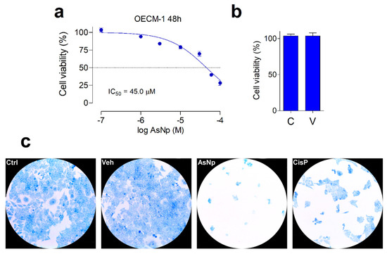 AsNP effects on OECM-1 cell viability. (a) Changes in cell viability, measured by resazurin reduction assay, obtained for 48 h treatments with 1–100 µM of AsNPs. (b) Cell viability in control cells (C) and in vehicle-treated cells (V), 0.03% chitosan for 48 h. (c) Loss of adherence of OECM-1 cells incubated with vehicle, 60 µM of AsNPs and 100 µM of CisP for 48 h, and stained with 0.2% methylene blue solution. In (a,b), data are expressed as mean ± SEM of 6 independent experiments.