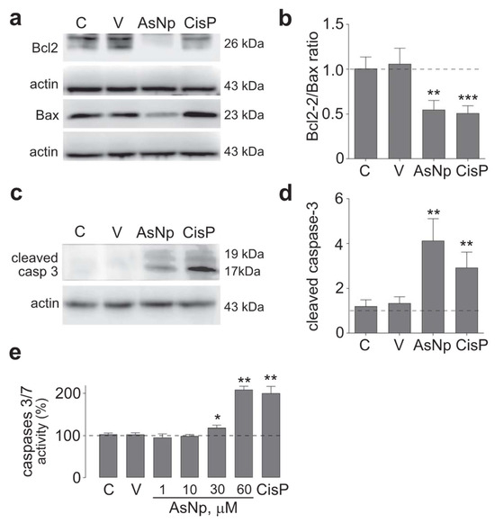 After these initial experiments, the possibility that AsNPs reduced cell proliferation through apoptosis induction on OECM-1 cells was explored. With this aim, protein levels of several apoptotic markers were evaluated by treating cells with 60 μM of AsNPs (concentration capable of reducing cell viability by ≈50%), 0.03% chitosan vehicle, and 100 μM of cisplatin (as a positive control) for 48 h. Initially, intrinsic apoptotic pathway mediators were assessed by establishing a protein level ratio between Bcl-2 (as anti-apoptotic marker) and Bax (as pro-apoptotic marker), observing a significant decrease in this ratio for both AsNP and cisplatin treatments (p < 0.01 and p < 0.001, respectively; Figure 3a,b). In addition, cleaved caspase 3 relative protein levels were determined as an active executor caspase marker, finding that both AsNP and cisplatin treatments significantly increased cleaved caspase 3 protein levels (p < 0.01 and p < 0.001, respectively; Figure 3c,d).