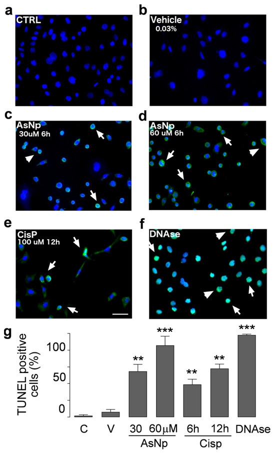 AsNP activity on apoptotic DNA fragmentation. TUNEL assay in untreated control (a), 0.03% chitosan (vehicle, (b)), and 30 and 60 µM AsNP treatments for 6 h ((c,d), respectively) was performed in OECM-1 cells. Positive controls correspond to 100 µM CisP for 12 h (e) and DNase I for 6 h (f). White arrows in (c–f) represent TUNEL-positive cells examples for each treatment condition. (g) Percentages of TUNEL-positive cells obtained by quantifying 100 cells per condition. C = control; V = vehicle). Parametric analysis was performed via Student’s t-test. Significance level was established at 0.001 ≤ p < 0.01 (**) and p < 0.001 (***).