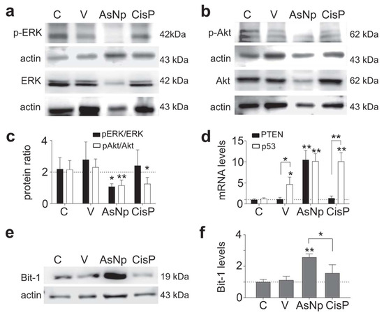 As it is widely known, anoikis modifies classic cell survival pathways like Erk and Akt, thus their relative phosphorylation ratios were evaluated via Western blot, finding that the p-Erk/Erk protein ratio decreased significantly in cells incubated with AsNPs and cisplatin (p < 0.01 and p < 0.05, respectively; Figure 5a,c). When the p-Akt/Akt protein ratio was studied, a decrease in its phosphorylated form was observed only in the AsNP-treated condition (p < 0.05, Figure 5b,c). In addition, there were no significant differences at both ratios when the vehicle-treated and untreated conditions were compared (p = 0.299 to pAkt/Akt, and p = 0.650 to pErk/Erk, Figure 5c). This Akt phosphorylation reduction observed in AsNP-treated OECM-1 cells was consistent with the increase in PTEN expression observed only for AsNP treatments (Figure 5d). Regarding p53 expression levels, a significant increase in its mRNA levels was observed for the 0.03% chitosan- (p < 0.05), AsNP- (p < 0.01), and CisP-treated conditions (p < 0.01; Figure 5d). To evaluate an anoikis-specific protein marker, Bit-1 relative protein levels were established via Western blot, observing a significant increase in Bit-1 relative levels in the presence of AsNPs (p < 0.001; Figure 5f), this effect being absent after CisP treatment (p = 0.453; Figure 5e,f).