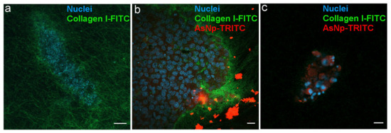 A homogeneously distributed fluorescent collagen matrix was observed around the 3D OECM-1 culture in the untreated condition (Figure 6a). In AsNP-treated cells, an important disruption of these collagen matrix assemblies, noticed by the evident loss of FITC signal, was observed (Figure 6c). When the distribution of the TRITC signal was analyzed, both intra- and extracellular staining was found, finding that AsNP-TRITC aggregates outside large OECM-1 spheroids (Figure 6b) and shows a greater intracellular TRITC intensity in smaller spheroids, where the nuclei of the cells exhibit an apparent degree of fragmentation (Figure 6c). Finally, and in order to discard if TRITC conjugation can compromise AsNP antiproliferative activity on OECM-1 cells, additional resazurin reduction assays were performed, finding that TRITC-conjugated AsNPs have similar effects as their non-conjugated counterpart (Supplementary Figure S2).
