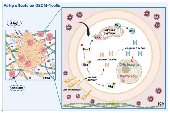 AsNP effects on OECM-1 cells. Arsenic nanoparticles (AsNPs) exert diverse effects in the OSCC cell line OECM-1. After AsNP treatment, an important increase in cell detachment is observed, this triggers a type of apoptosis called anoikis (red cells), which can be proven by the increases in Bit-1 relative protein levels, caspases 3/7 activity, Akt/Erk phosphorylation inhibition, and its interaction with ECM components like collagen I. In addition, AsNPs can also be internalized by OECM-1 cells, activating the intrinsic pathway of apoptosis through alterations in the Bcl2/Bax relative protein ratio. Created with BioRender.com (https://app.biorender.com/user/signin; accessed on 13 April 2024).