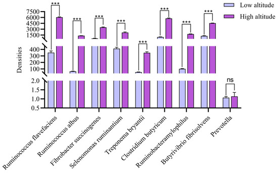 Rumen microbiota densities at different altitudes. Note: *** indicates a highly significant difference (p < 0.001); ns indicates that the difference is not significant.