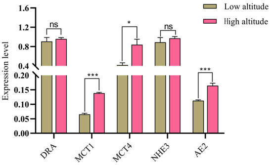 Expression of rumen epithelial transporter genes at different altitudes. Note: *** indicates a highly significant difference (p < 0.001); * Indicates a significant difference (p < 0.05); ns indicates that the difference is not significant.