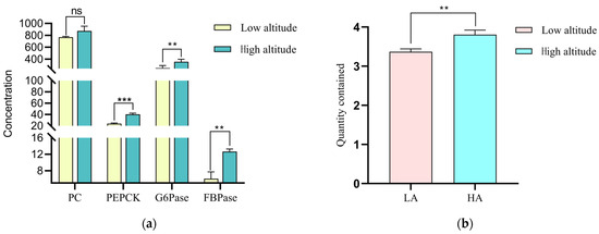 Liver gluconeogenesis key enzyme content and glucose content in Tibetan sheep at different altitudes: (a) Liver key enzyme content at different altitudes; (b) liver glucose content at different altitudes. Note: *** indicates a highly significant difference (p < 0.001); ** indicates a highly significant difference (p < 0.01); ns indicates a non-significant difference.