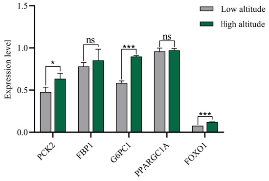 Expressions of liver gluconeogenesis-related genes at different altitudes. Note: *** indicates a highly significant difference (p < 0.001); * indicates a significant difference (p < 0.05); ns indicates that the difference is not significant.
