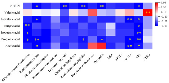 Rumen microbiota density–VFAs–VFAs transporter gene correlations heat map. Note: Correlation heatmap * p < 0.05, ** p < 0.01.