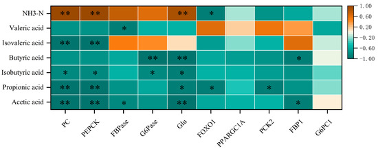 Heat map of rumen VFAs–hepatic gluconeogenesis function correlations. Note: Correlation heatmap * p < 0.05, ** p < 0.01.