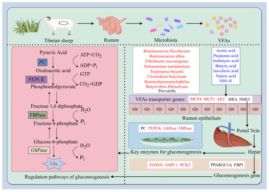 The rumen is a unique, dynamic and continuous digestive and metabolic organ of ruminants that serves as a “natural fermentation tank” for degrading fiber substances [2]. It is rich in various microorganisms such as bacteria, fungi and protozoa. The microbial community can be divided by function into cellulose-degrading bacteria, including R. flavefaciens, R. albus and Fibrobacter subgenres, Treponema bryantii (T. bryantii), Butyrivibrio fibrisolvens (B. fibrisolvens) and Prevotella; Rumnobacter amycophilus belonging to starch-degrading bacteria; Clostridium butyricum (C. butyricum) related to fat-degrading bacteria; and Selenomonas ruminantium (S. ruminantium), which originated from lactic acid-using bacteria [3,4]. They play important roles in forage fermentation and energy supply. Natural grazing is the main way to provide energy for Tibetan sheep, and natural grass is their main source of nutrition [5]. Due to differences in altitude, there are differences in environmental factors such as temperature, humidity and oxygen content in high-altitude areas, which in turn affect forage growth. Research has shown that with increasing altitude and decreasing aboveground biomass and height, grass exhibits a decrease in crude fiber content [6] and fiber-degrading bacteria, as the main microbial group producing VFAs leads to metabolic changes in VFA content. Therefore, after grazing, grasses experience anaerobic fermentation by rumen microorganisms, producing various VFAs, including acetic acid, propionic acid, butyric acid, isobutyric acid, valeric acid and isovaleric acid. Among them, propionic acid, acetic acid and butyric acid account for more than 95% of the total content [7]. The NH3-N in the fermentation products is also an important indicator that reflects the fermentation status and absorption rate of nitrogen-containing compounds in the rumen [8]. The rumen epithelium, as the main site of energy absorption, has an efficient VFA transport system, which is highly dependent on the surface area of the epithelium and the expressions of transport proteins [9]. The related transport proteins include monocarboxylate transporter carrier (MCT) [10,11], sodium hydrogen exchange protein (NHE) [12] and AE2 [13]. Intestinal hepatic crosstalk has a profound impact on energy homeostasis. Compounds such as VFAs can enter the portal venous circulation and reach the liver to participate in glucose homeostasis. Among them, propionic acid is a major VFA that is involved in the activation of intestinal gluconeogenesis [14]. Studies have shown that propionic acid can increase the production rate of glucose in the liver. A significant supply of propionic acid not only increases the concentration of metabolites in the pyruvate and citric acid cycles of the liver but also accelerates endogenous glucose production [15]. Therefore, the amount of propionic acid absorbed by the portal vein increases, and the absorption and utilization of propionic acid by the liver significantly increase gluconeogenesis and glucose production through the up-regulation of transport genes. Therefore, VFAs can serve as signaling molecules that are transported by the rumen epithelium into the hepatic portal vein to participate in hepatic gluconeogenesis metabolism.