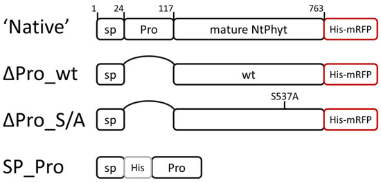 2.2. Elimination of the Prodomain from the NtPhyt Precursor Compromises Proteolytic Activity and Secretion of NtPhyt