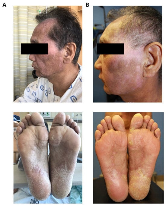 Representative Clinical Improvement of unique patient number (UPN)-1. Face (upper panel) and soles (lower panel) of the patient prior to (A) and following (B) four mesenchymal stem cell (MSC) infusions administered every two weeks.