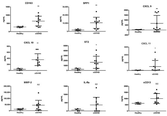 Potential biomarkers upregulated in chronic graft-versus-host disease (cGVHD) patients. Multiplex analysis of plasma samples during the monitoring period is shown. Nine biomarkers that showed significant differences between cGVHD patients (n = 10) prior to mesenchymal stem cell (MSC) infusion and healthy controls (n = 5) were observed. p-values for comparing cGVHD and healthy controls with t test: * p < 0.05, ** p < 0.005. cGVHD, chronic graft-versus-host-disease; IL-Ra, interleukin receptor alpha; CXCL 10, C-X-C motif chemokine ligand 10; CXCL 11, C-X-C motif chemokine ligand 11; CXCL 9, C-X-C motif chemokine ligand 9; MMP-3, matrix metalloproteinase-3; s, soluble; SPP1, secreted phosphoprotein 1; ST2, suppression of tumorigenicity 2.