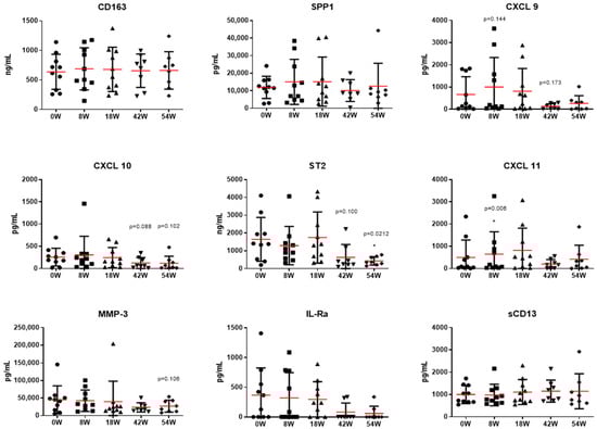 MSC therapy is associated with reduced inflammatory markers. Nine selected biomarkers were observed prior to mesenchymal stem cell (MSC) infusion (0 W) up to 54 weeks. Several inflammatory markers, including CXCL 9, CXCL 10, ST2, and IL-1Ra, showed a reducing trend following MSC infusion. Furthermore, 10 patients were evaluated at weeks 0, 8, and 18; and 8 patients were evaluated at weeks 42 and 54 following the first MSC infusion. Red line indicates mean value, and the error bars indicate the standard deviation. p-value for comparing week 0 with t test: * p < 0.05. IL-Ra, interleukin receptor alpha; CXCL 10, C-X-C motif chemokine ligand 10; CXCL 11, C-X-C motif chemokine ligand 11; CXCL 9, C-X-C motif chemokine ligand 9; MMP-3, matrix metalloproteinase-3; SPP1, secreted phosphoprotein 1; ST2, suppression of tumorigenicity 2; W, week.