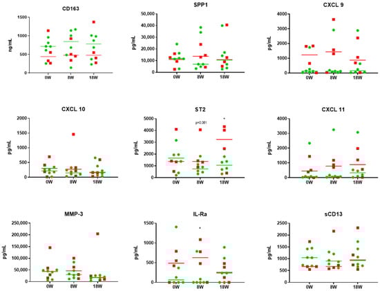 Inflammatory markers are upregulated in non-responders. Nine selected biomarkers were observed prior to mesenchymal stem cell (MSC) infusion (0 W), at 8 and 18 weeks following MSC infusion between responders (n = 6) and non-responders (n = 4). Green circles and lines indicate patients who responded to MSC therapy. Red squares and lines indicate patients who did not respond to MSC therapy. p-value for comparing responders and non-responders with t test: * p < 0.05. IL-Ra, interleukin receptor alpha; CXCL 10, C-X-C motif chemokine ligand 10; CXCL 11, C-X-C motif chemokine ligand 11; CXCL 9, C-X-C motif chemokine ligand 9; MMP-3, matrix metalloproteinase-3; SPP1, secreted phosphoprotein 1; ST2, suppression of tumorigenicity 2; W, week.