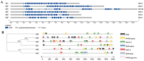 The gene structure of Sichuan bream vitellogenin. (A) A schematic representation of the genomic structure of vtg1–6 (drawn to scale); (B) Promoter sequence analysis diagram. The phylogenetic tree based on vtg promoter sequences is shown on the left, and the corresponding distribution of predicted cis-acting elements is shown on the right.