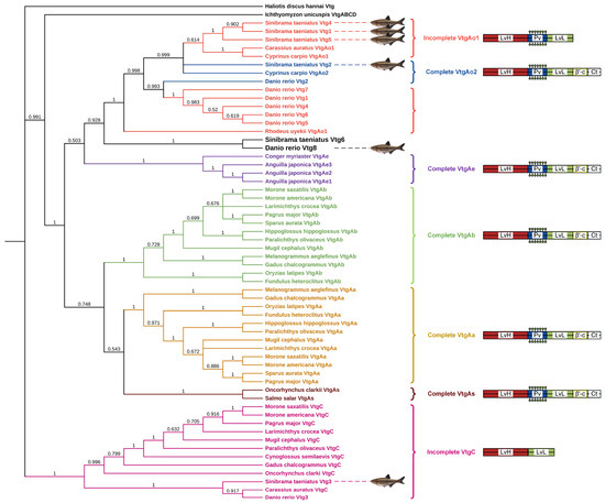 Vtg is encoded by a variable number of paralog gene families, and the diversity of Vtgs has been extensively confirmed and explored in past studies [6,7,8]. The current understanding suggests that teleosts produce multiple variants of Vtg, as evidenced by the discovery of 8 Vtg genes in zebrafish (Danio rerio) [9] and up to 20 Vtg genes in rainbow trout (Oncorhynchus mykiss) [10]. The evolutionary history of the vitellogenin gene family has been extensively studied, and it is widely believed that the presence of multiple copies of vitellogenin in the genome can be attributed to whole genome duplication (WGD) events [11]. Vertebrates underwent four rounds (R) of WGD, including 1R and 2R that existed before the evolutionary differentiation of vertebrates, 3R that occurred in teleosts and subsequent 4R experienced specifically by salmonids. Theoretically, teleosts should possess a total of eight Vtg genes. However, the quantity of Vtg may vary among species due to events such as lineage-specific gene losses and duplications, which could concurrently confer new functions on Vtg [12,13]. In addition to serving as a nutrient reserve, vitellogenin-derived YPs have been shown to regulate egg buoyancy by participating in oocyte hydration [14,15]. In addition, Vtgs have been found to play a pivotal role in physiological processes, such as antimicrobial [16], immune [17] and antioxidant activities [18] in fish. These processes appear species-specific, so studying Vtgs’ structures in different species can enhance our comprehension of ovarian development, regulatory processes, structure-function correlations and environmental adaptation.