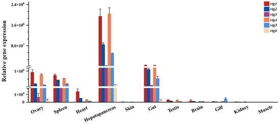 The transcript levels of vtgs among different tissues of adult Sichuan bream were analyzed with qRT-PCR (Figure 3), and the results revealed that the expression of vtgs was obviously tissue specific. The liver (hepatopancreas) exhibits the highest gene expression level, followed by the gut, where the relative expression of vtgs is 24-94 times greater than in the gut. A significant expression of vtgs was also detected in the ovary, spleen and heart, with minimal relative expression of vtgs in the other tissues tested. Among all the tissues showing apparent vtg expression, type Ⅰ vtgs predominated, particularly vtg1 and vtg4, which contributed nearly equal amounts of substantial expression except in the heart. Subsequently, vtg2 and vtg3 followed in that order. It is noteworthy that vtg6, characterized by the lowest molecular weight, exhibits the most minor expression level across all tissues.