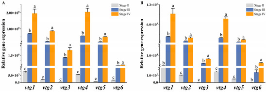 We further investigated the expression profiles of vtgs in the liver and ovary at different developmental stages to elucidate their contribution to vitellogenesis. The results demonstrated a similar expression pattern of vtgs between the two tissues, exhibiting a weak expression prior to vitellogenesis (stage II) and a rapid surge during the active phase of vitellogenesis (stage III), ultimately peaking in late vitellogenesis (stage IV). The liver underwent dramatic changes during the vitellogenesis stage, with a consistent and significant increase in the expression of all vtgs observed at both stage III and stage IV (p ˂ 0.05) (Figure 4A). In the ovary, the expression of vtg2, vtg3, vtg4 and vtg5 increased significantly with different developmental stages (p ˂ 0.05), while the expression of vtg1 and vtg6 was significantly upregulated only at stage IV (p ˂ 0.05) (Figure 4B).