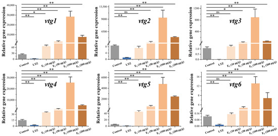 Effect of letrozole (LTZ) and different concentrations of E2 treatments on the relative expression of Sichuan bream vitellogenin genes in the liver. * p < 0.05; ** p < 0.01; ns means values between the comparison groups were no significantly different (p > 0.05).