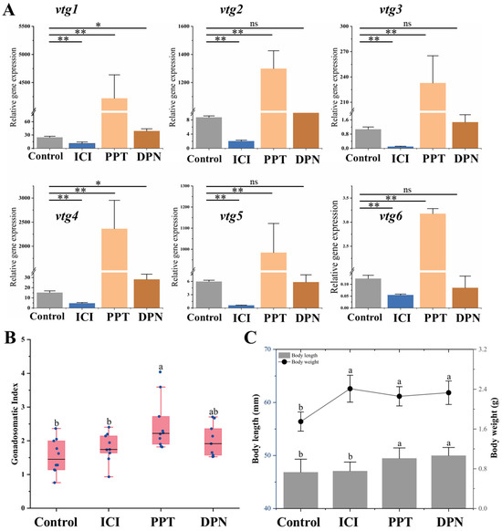 In order to elucidate the specific role of nuclear estrogen receptors (nERs) in regulating vitellogenesis, a 3-week feeding experiment was conducted using a feed supplemented with 100 μg/g selective estrogen receptor modulators (SERMs). The findings demonstrated distinct response patterns of vtgs in the liver towards these chemicals. It was observed that after treatment with nERs antagonist ICI, the expression of all Vtgs’ mRNA was significantly inhibited (p ˂ 0.05). The compound PPT acts as a specific agonist of ERα, leading to a significant upregulation in the expression levels of all vtgs by 26 to 170 times. It is noteworthy that the specific agonist DPN, targeting ERβ, only induces a modest increase of 1.6 and 1.9 times in the expression levels of vtg1 and vtg4 (Figure 7A). In addition, the administration of these SERMs did not cause significant changes in ovarian histological characteristics (Supplementary Figure S2). However, the GSI after PPT treatment exhibited a significantly higher value than the control and the ICI-treated groups (p ˂ 0.05). There was no significant difference between GSI treated with DPN and other groups (p > 0.05) (Figure 7B). In terms of growth parameters, the body length of both estrogen receptor agonist-treated groups was significantly greater than that of the control and inhibited groups (p ˂ 0.05). The body weight of the control group was significantly smaller than that of the other groups (p ˂ 0.05) (Figure 7C).