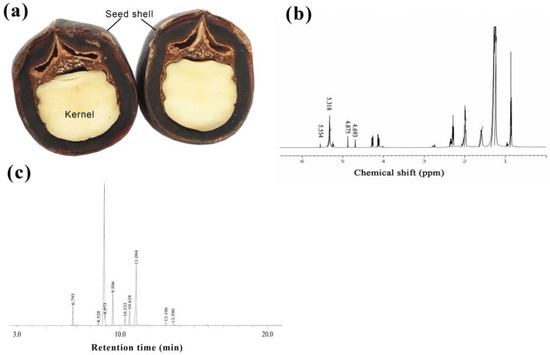 (a) Sagittal section of the S. mukorossi seed. Seed kernel is covered by a hard, black shell. (b) The plant species was confirmed by 1H nuclear magnetic resonance (NMR). (c) The composition and content of FA found in the S. mukorossi seed oil was detected using gas chromatography–mass spectrometry.