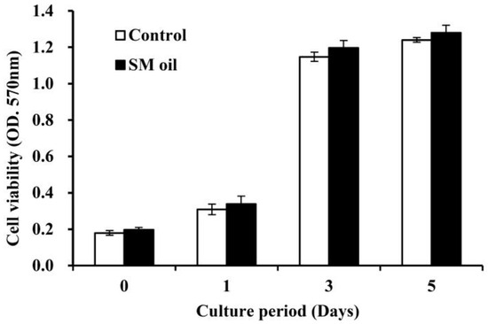 Viabilities of MSCs cultured with S. mukorossi seed oil for 5 days. During the incubation period, S. mukorossi seed oil showed no significant effect on WJMSC viability. SM denotes S. mukorossi.