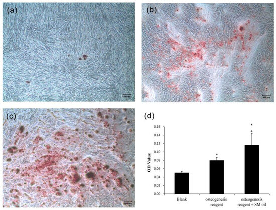 Alizarin Red S staining demonstrated that osteogenic differentiation of WJMSCs was promoted by adding S. mukorossi seed oil. (a) Mineralized nodule deposition was not observed when MSCs were cultured in standard medium. (b) After induction with osteogenic medium, visible deposition of mineralized nodules occurred (red spots). (c) After co-culturing with both osteogenic medium and S. mukorossi seed oil, WJMSCs secreted a greater number of mineralized nodules. (d) Quantification of Alizarin Red S staining reveals a notable increase in mineralized nodules due to the inclusion of S. mukorossi seed oil. (* and + denote comparisons with the blank group and osteogenic medium, respectively. p < 0.05, scale bars denote 100 μm. SM denotes S. mukorossi).