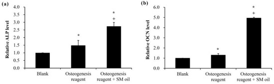 Osteogenic gene expression levels, including (a) ALP and (b) OCN, assessed following culturing of WJMSCs in standard medium, osteogenic medium, and osteogenic medium with seed oil. The addition of S. mukorossi seed oil significantly increased the expression level of both ALP and OCN. (* and + denote comparisons with the blank group and osteogenic medium, respectively. p < 0.05. SM denotes hydrogel and S. mukorossi).