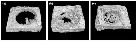 Micro-CT 3D images of bone defects grafted with various materials. Compared to the control group (a), both the HG and HG-SM oil group increased bone growth (b). The addition of S. mukorossi seed oil to HG increased bone growth efficiency after 4 weeks of healing (c).