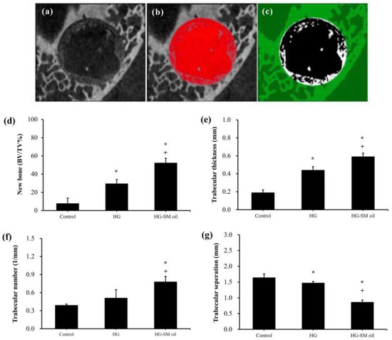 Quantification of micro-CT images (a–c) showed that adding S. mukorossi seed oil to bone grafts significantly increased the (d) efficiency of new bone formation, (e) trabecular thickness, (f) trabecular number, and (g) amount of trabecular separation. (* and + denote comparisons with the control and HG groups, respectively. p < 0.05). HG and SM denote hydrogel and S. mukorossi, respectively. (n = 4).