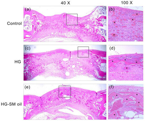 Histological images of bone tissue at artificial defects created in this study. Microscopy shows tissue grafted with blank (a,b), HG (c,d), and HG-SM oil (e,f) at 4 weeks post healing (* denotes newly formed bone). HG and SM denote hydrogel and S. mukorossi, respectively.