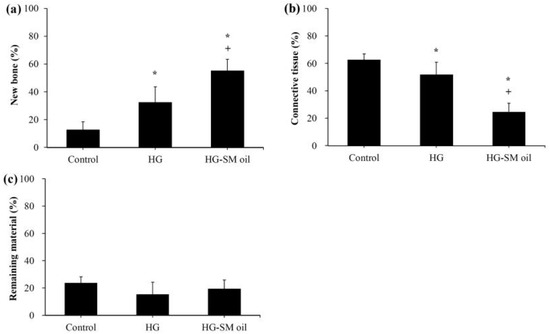 Quantitative analysis of measurements from histological images of (a) new bone formation, (b) connective tissue, and (c) remaining material. (* and + denote comparisons with the control and HG groups, respectively. p < 0.05. HG and SM denote hydrogel and S. mukorossi, respectively). (n = 4).