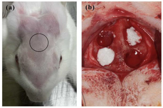Animal experiment performed in this study. (a) Black circle indicates the surgical site. (b) Four 6 mm circular bone defects were prepared on each rabbit skull and filled with tested materials.