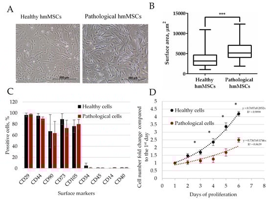 Molecular characterization of non-dilated/healthy and dilated/pathological myocardia-derived hmMSCs. (A) Morphology of healthy and pathological hmMSCs. (B) Distribution of healthy and pathological cells according to the cell attachment area calculated from 100 attached cells. (C) Surface marker profile in healthy and pathological hmMSCs. (D) The proliferation rate of healthy and pathological hmMSCs. Data are statistically significant at * p < 0.05 and *** p < 0.01, n = 3, comparing healthy and pathological cells.