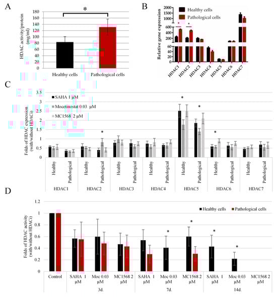 HDAC activity and expression profiles in healthy and pathological hmMSCs. (A) HDAC activity of healthy and pathological hmMSCs (arbitrary fluorescence units/protein (mg/mL)). (B) Relative expression of HDAC 1–7 (2−ΔCT) of healthy and pathological hmMSCs. (C) Relative expression of HDAC 1–7 genes in healthy and pathological hmMSCs after the exposure to SAHA (1 µM), mocetinostat (0.03 µM) and MC1568 (2 µM) for 3 days. (D) Change of HDAC activity in healthy and pathological cells after exposure to SAHA (1 µM), mocetinostat (0.03 µM) and MC1568 (2 µM) for 3, 7, 14 days; ratio to the control cells. Data are statistically significant at * p < 0.05, n = 3, comparing healthy and pathological cells (A–C) and effects of inhibitors on those cells (D).