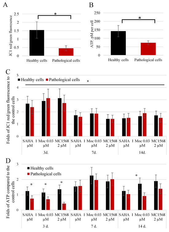 The energetic status of healthy and pathological hmMSCs and impact of HDAC inhibitors. (A) The mitochondrial membrane potential of healthy and pathological hmMSCs. (B) The total level of ATP per cell in healthy and pathological hmMSCs. (C,D) Folds of change of mitochondrial membrane potential and ATP production, respectively, in healthy and pathological hmMSCs after exposure to SAHA (1 µM), mocetinostat (0.03 µM) and MC1568 (2 µM) for 3, 7 and 14 days. Data are statistically significant at * p < 0.05, n = 3, comparing 3, 7 and 14 days (C) and healthy and pathological cells (D).