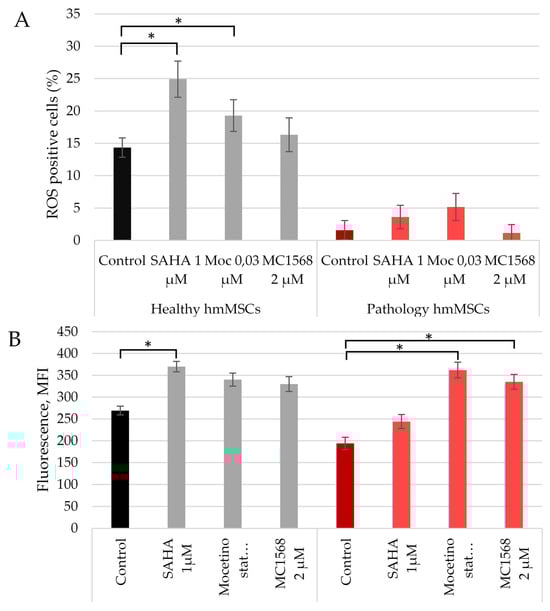 The effect of HDAC inhibitors on the intracellular ROS levels and total level of acetylated lysine in healthy and pathological cells. (A) The change of intracellular levels of ROS in healthy and pathological hmMSCs w/o and with HDACi. (B) The total level of acetylated proteins in both types of cells incubated with SAHA (1 µM), mocetinostat (0.03 µM) and MC1568 (2 µM) for 3 days. Data are statistically significant at * p < 0.05, n = 3, comparing the effects of HDAC inhibitors on healthy and pathological cells with control cells.