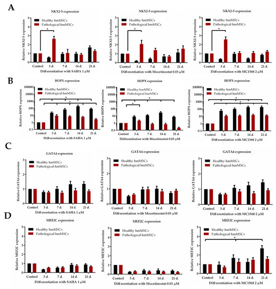All HDAC inhibitors, SAHA, mocetinostat, and MC1568, promoted significant increases in the expression of the main cardiomyogenic differentiation-regulating transcription factor NKX2-5 in pathological cells (2.64 ± 0.24, 2.07 ± 0.4, and 2.57 ± 0.28), respectively, but not in healthy hmMSCs during the first 3 days of incubation (Figure 5A).