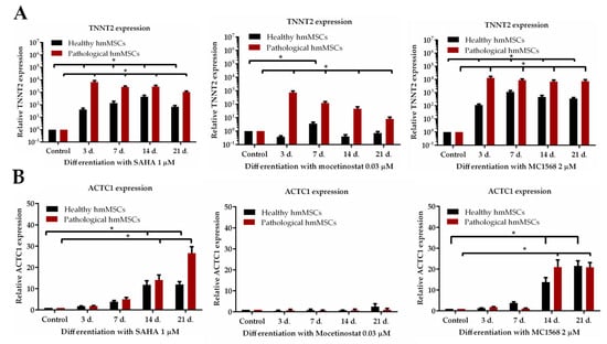 Similarly, the HDAC inhibitors SAHA and MC1568 were more effective in promoting the expression of another cardiac structural protein, alpha cardiac actin, in both healthy and pathological hmMSCs at the 21st day of exposure, i.e., 1 μM SAHA increased the expression of ACTC1 by 11.9 ± 1.3 and 26.7 ± 4.3, while MC1568 increased it by 21.5 ± 2.3 and 20.8 ± 2.2 folds, respectively (Figure 6B). The effect of the HDAC inhibitors SAHA and MC1568 on the expression of alpha cardiac actin was more pronounced than that of mocetinostat.