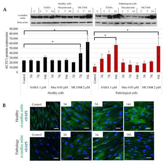 To confirm the effect of HDAC inhibitors on the main component of thin myofibril filaments and alpha cardiac actin, we investigated the levels of actin using Western blotting (Figure 7A) and microscopically (Figure 7B) in both healthy and pathological hmMSCs with and without the HDAC inhibitors. The data confirm that the HDAC inhibitors SAHA and MC1568 increased the level of alpha cardiac actin and promoted the formation of cardiac tissue-typical fibers in both healthy and pathological cells. Both types of cells exhibited less responsiveness to mocetinostat, suggesting that its effect might be too strong to activate cardiac transcription factors and structural proteins at both the protein and gene levels.