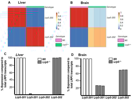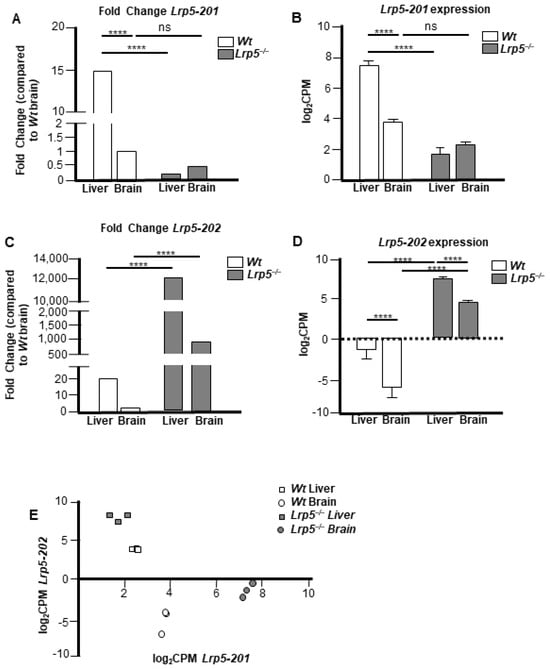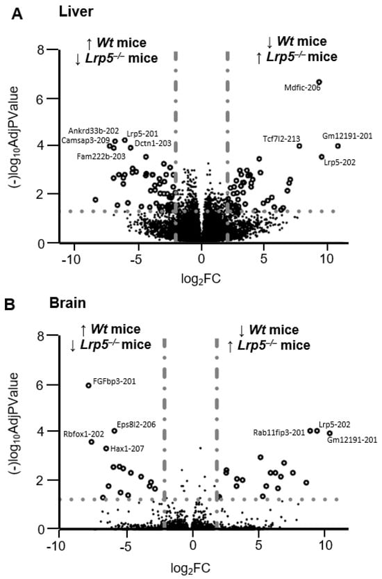 2.3. Lrp5 Transcriptome Is Different in Livers and Brains of Lrp5−/− Mice